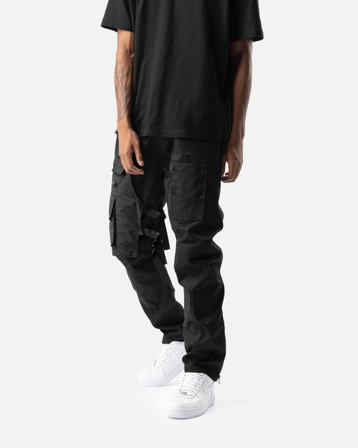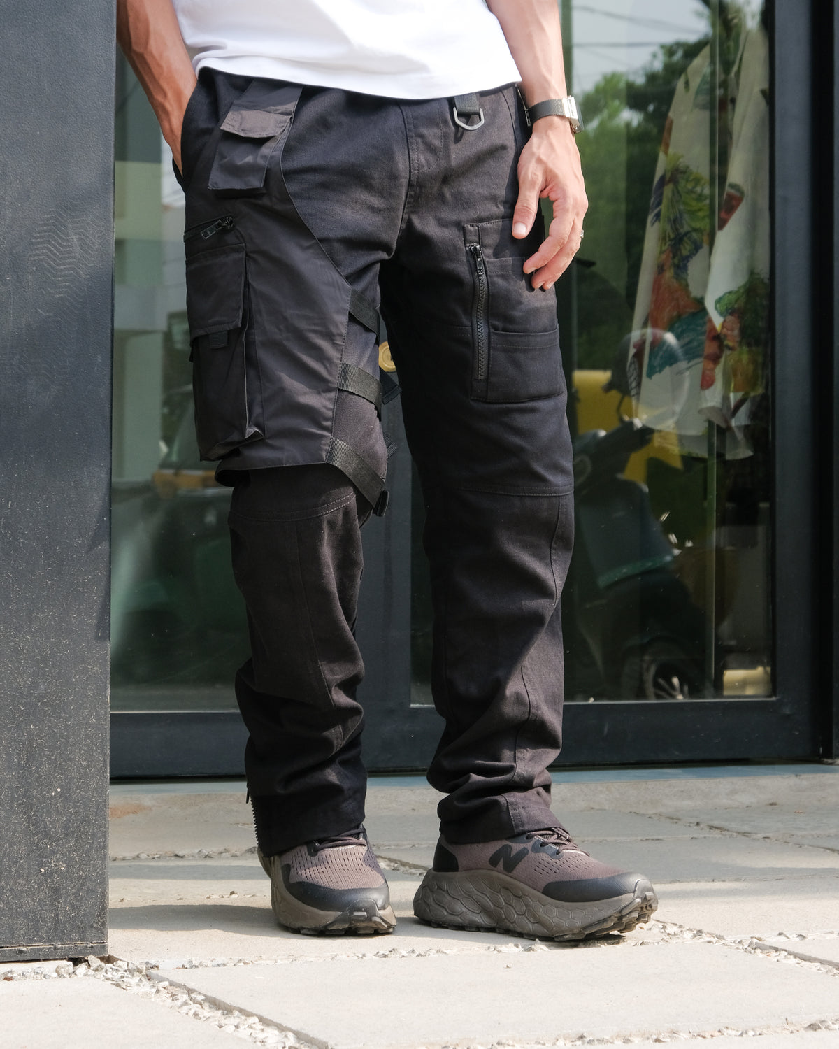 It features a zipped front pocket, a detachable utility pocket on the right secured with an oxidized G-hook, and an elastic waistband with a utility belt that actually does its job.